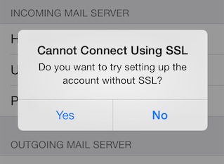 If you wish to proceed anyway, you can try just clicking Save after seeing the following dialog. You will definitely have incoming mail, for e-mails you receive, but may not have outgoing mail, for e-mails you send, set up properly. For example, our iPhones on AT&T and Verizon can send outgoing e-mail, but we we connect to a hotel wireless or other hotspot, we can often no longer send SSL e-mail, and often no e-mail at all via the outgoing mail settings (SMTP 25 and 587). There blocks are on purpose generally as an easily effective way for people to block spam e-mail leaving their networks. If you are on a home wireless, you should use the SAME OUTGOING SMTP SETTINGS as your ISP gave you for your e-mail account with them.
