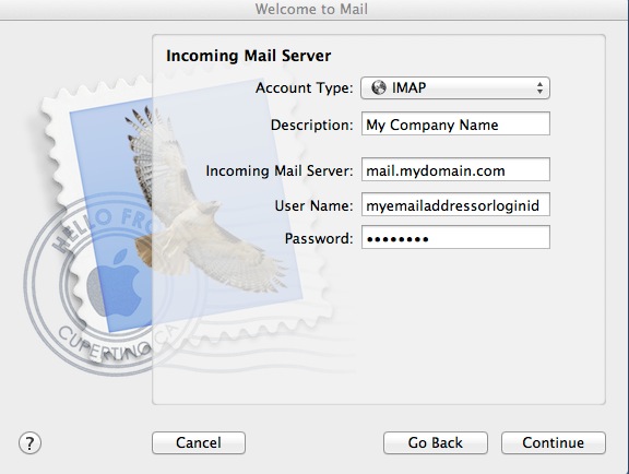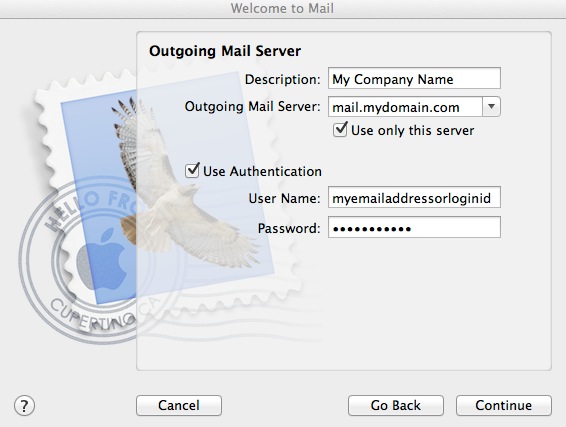 If you are using OS X 10.8, and get a message that the SMTP server is not responding, deselect the checkbox option Use only this server and click Continue again. You will have an extra screen to complete. We are working around a bug in the application. (It actually doesn't seem to matter if you start out selected or not selected for this box - it fails. So you toggle the selection and continue to get to the next screen.)