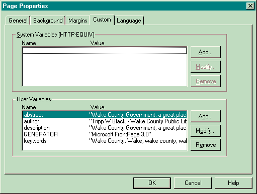 - The upper section contains "system" variables which specify certain server/web page formatting parameters and where you can add such add-ons as ratings for your pages (similar to movie or TV content ratings.) The lower section contains the "user variables" which lists some FrontPage page configurations and the meta tags.