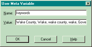 - To create a new meta tag, press the lower "Add" button. In the upper section, enter the first variable name, and in the lower section, enter its value. Press "OK" to enter the meta tag into the page's properties.