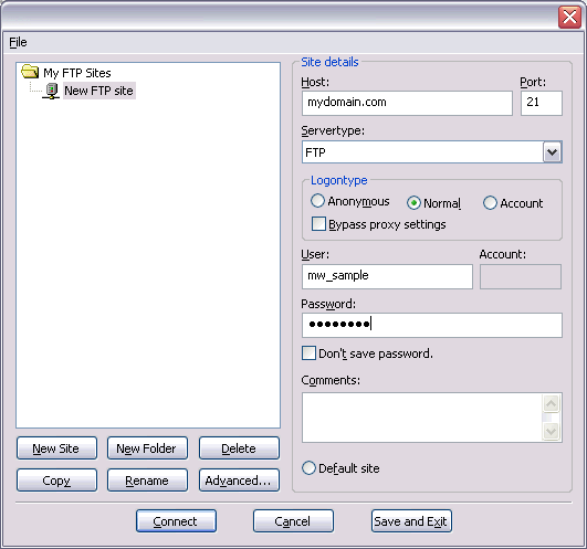 Add a new FTP (Web Site) to FileZilla: