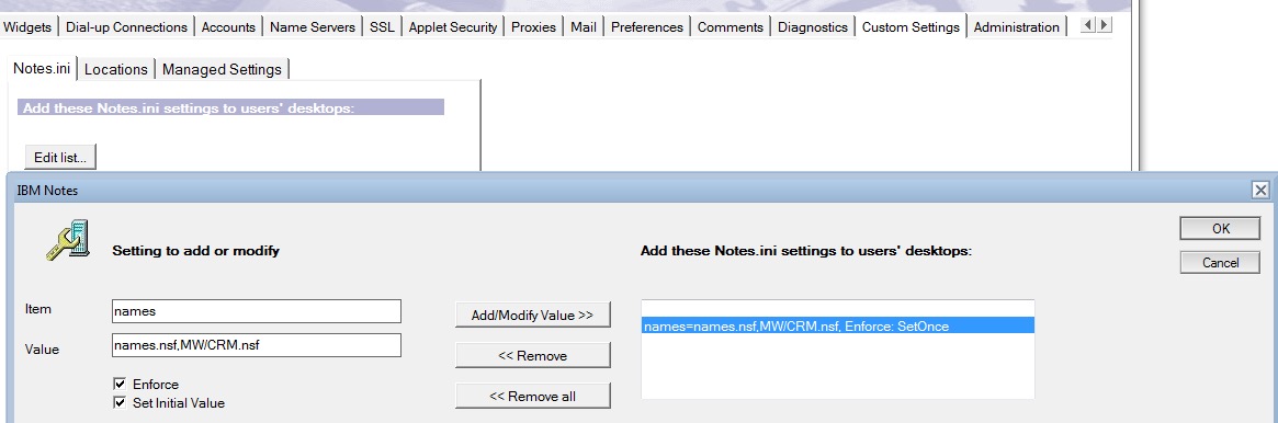Settings document --> Custom Settings --> Notes.ini --> Edit list --> Enter the item, names, and the value, names.nsf,MW/CRM.,nsf, for this example, click OK. Save the Settings document.