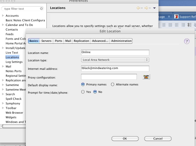 Top application menu --> Lotus Notes --> Preferences --> Locations tab --> Select Online location --> click Edit button. (Mac)