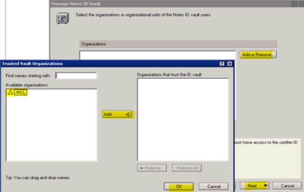 8. In the Manage Notes ID dialog, the Vault Management Progress give a review of the organization selected to re-add, and the names to re-add.