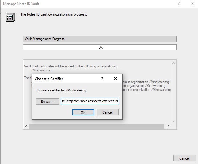 9. In the Manage Notes ID dialog, on the The Notes ID vault configuration is in progress page prompts for the certificate ID file and the password.