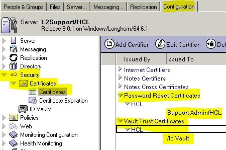 a. Delete the authorized ID Vault certificate documents for people who administrate the ID Vault. (use the delete keyboard key, not the Delete Certifier button.)