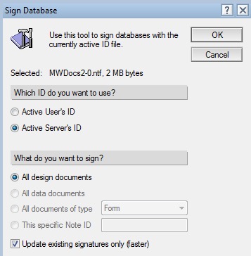 - Using the Administrator client, switch to Domino server used in the step above, and change to the Files tab, locate the new application and sign it.