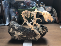 | September 3 | I glued on the limbs. The ribs proved difficult, since gravity kept making them droop. While those dried, I cut a fallen branch for the base. I glued the foot phalanges directly to the wood and positioned the body, then glued the legs to the tarsals. I kept the skeleton in place with a few props until the glue dried. After that, I took the entire ensemble outside and sealed it thoroughly with aerosol polyurethane.