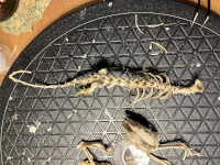 | August 25, 2023 | No pictures of the harvest or curing, but I went through the motions of harvest, hydrogen peroxide bath, toothbrush scrub, and sunbath. The aluminum tin sat on my desk for several months until I had some spare time. I had gotten a plastic artist's Lazy Susan and it's a lovely shade of black which contrasts nicely with the white bones, making them much easier to see! So I organized the bones by location and limb. Some of the phalanges were missing, but that was expected. |
